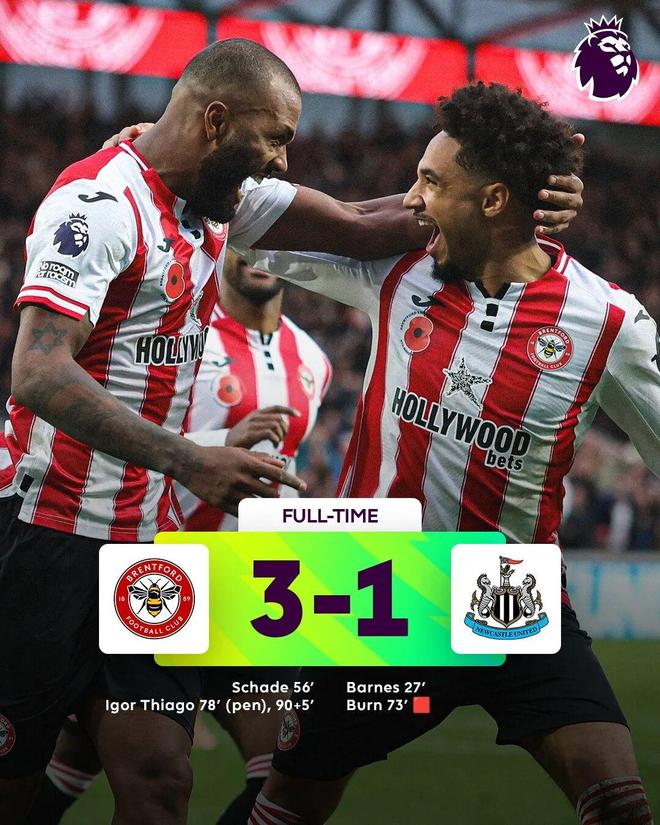 隨后,沙德頭球破門扳平比分,丹-伯恩送點后染紅離場。伊戈爾-蒂亞戈梅開二度幫助布倫特福德鎖定勝局。最終,布倫特福德3-1逆轉戰勝紐卡。