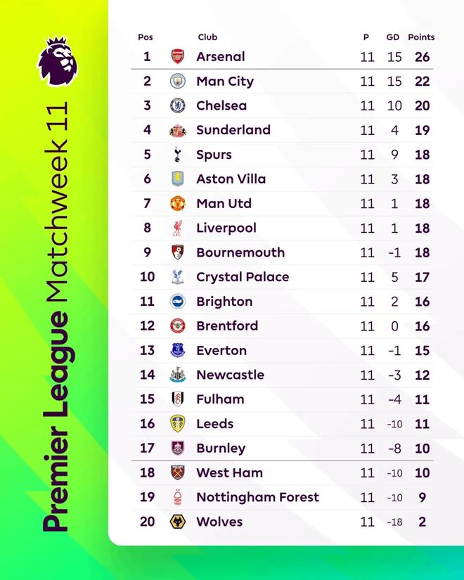 本輪過后,目前槍手依然領跑英超積分榜,曼城落后4分位居第二位,切爾西20分排在第3名,桑德蘭19分排在第4位,從第5名到第9名的球隊,全部積18分,競爭異常激烈。