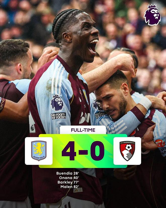 易邊再戰,塞門約主罰點球被大馬丁撲出,隨后,巴克利、馬倫先后取得進球。最終,維拉4-0大勝伯恩茅斯。